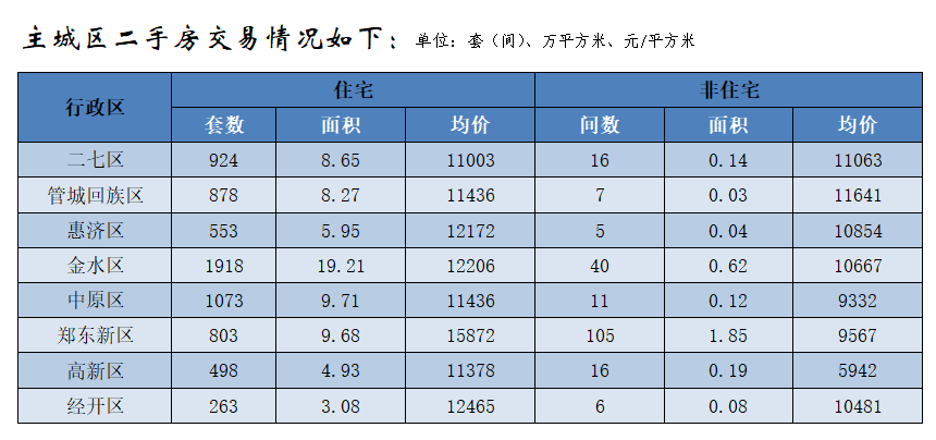 郑州全市商品房销售13341套(间),销售面积152.30万平方米,销售均价11315元/平方米;其中商品住宅销售11319套,销售面积137.65万平方米,销售均价11671元/平方米。非住宅销售2022套(间),非住宅销售面积14.65万平方米,非住宅销售均价为7967元/平方米。