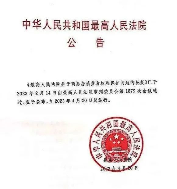 《最高人民法院关于商品房消费者权利保护问题的批复》已于2023年2月14日由最高人民法院审判委员会第1879次会议通过,现予公布,自2023年4月20日起施行。