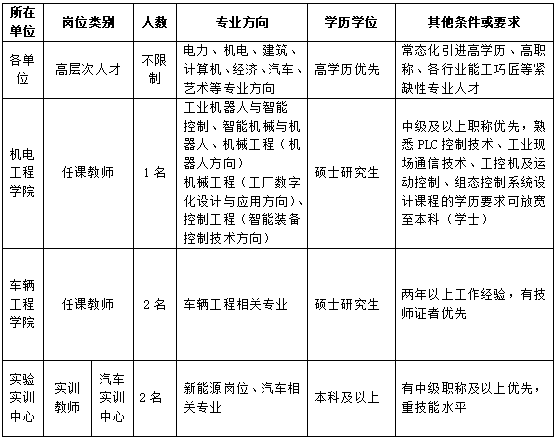 同时,学校常年引进高学历(博士研究生)、高职称(副高以上)、各行业能工巧匠等紧缺性专业人才,有意向者可投递简历。