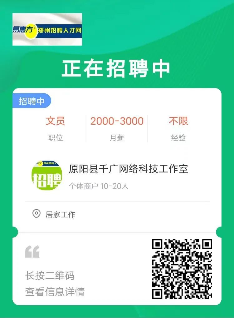 文员、会计、财务、普工…郑州年后众多岗位紧急招人!关注【郑州招聘人才网】公众号,找工作投简历,快人一步!下面小编给大家汇总了一波招聘信息,来看看有哪些企业招人吧~找工作、找人才,就上郑州招聘人才网!我们专注郑州本地招聘,致力于为您提供优质招聘求职服务。
