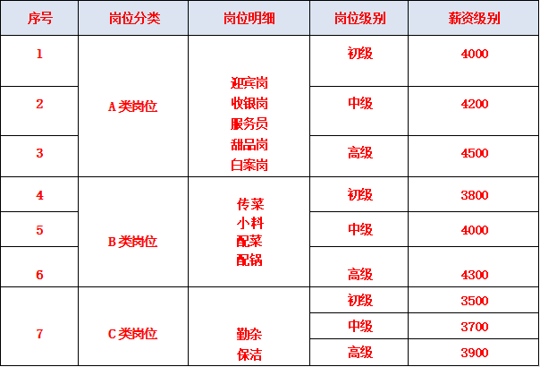 甜品,白案,传菜员,小料员,配锅员,配菜员,勤杂