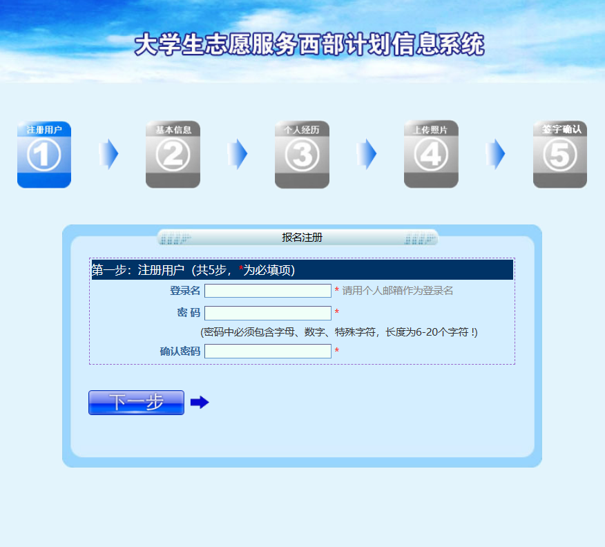 登录西部计划官网: http://xibu.youth.cn。点击西部计划报名系统→点击志愿者报名→填写邮箱地址→点击"我要报名”