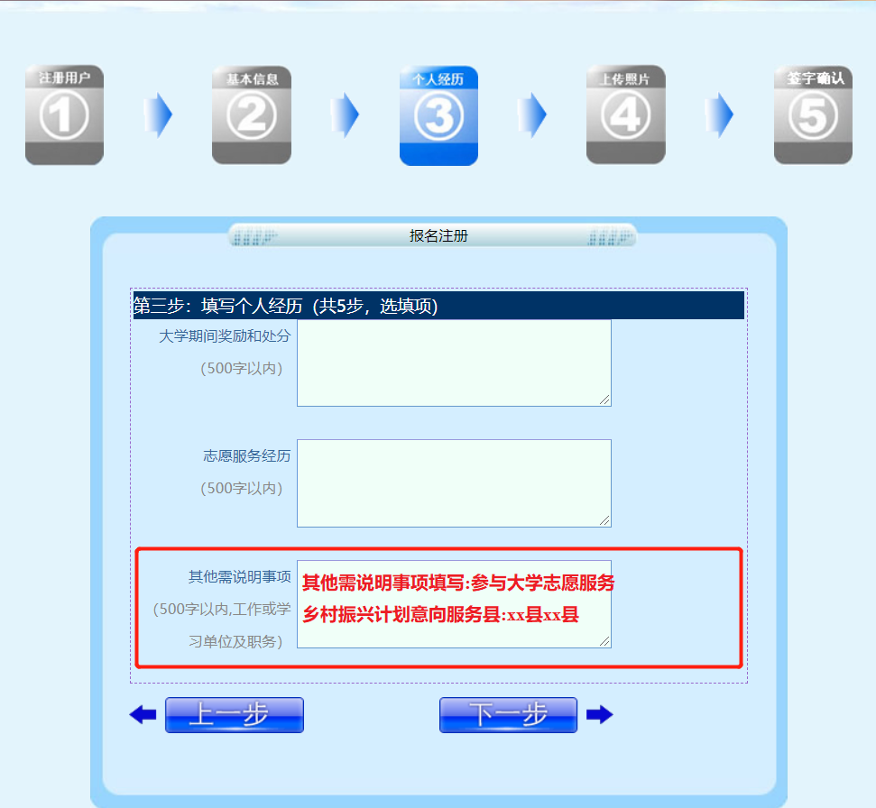 如报名参加河南省大学生志愿服务乡村振兴计划,在其他需说明事项填写:参与大学志愿服务乡村振兴计划意向服务县:xx县 xx县。
