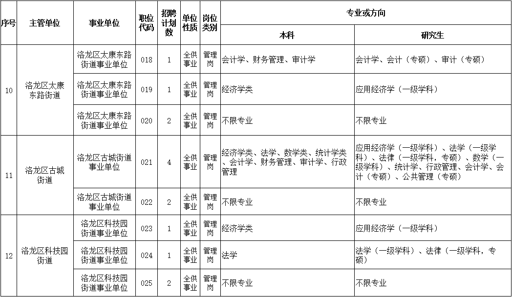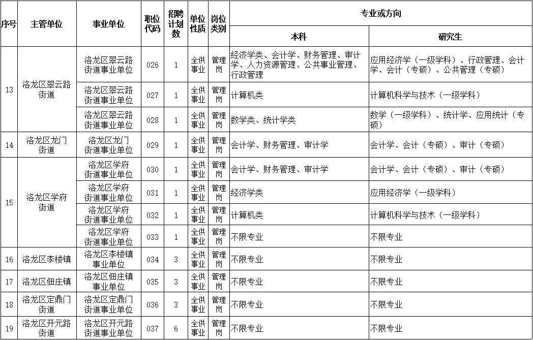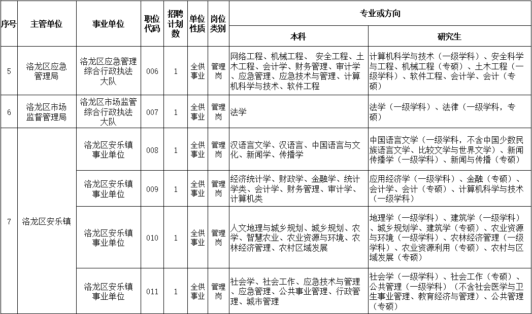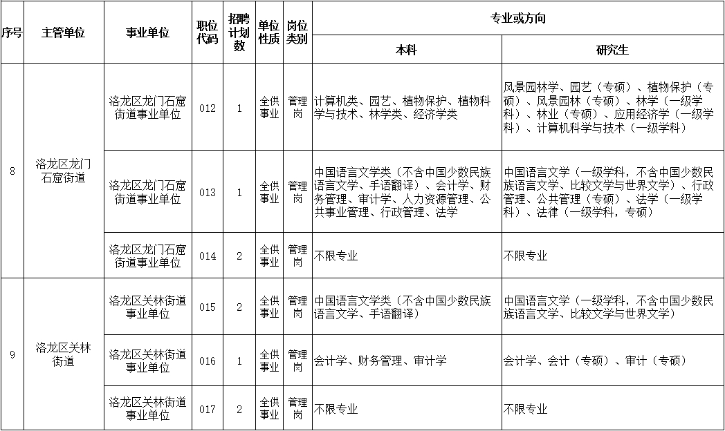 8、严格按照《2023年洛龙区公开招聘事业单位工作人员职位表》(附件1)的专业要求报考。《职位表》中招聘岗位所要求的专业按照教育部、国务院学位办下发的相关专业目录准确、规范的称谓执行;考生所学专业以毕业证书专业为准,毕业证上标注的学历及专业应当与招聘岗位要求的学历及专业一致(仅是学位证书上专业与《职位表》专业一致视为专业不符),毕业证书上专业后面带括号,考生以括号以外的专业名称报考相符合的岗位(教育部公布的“专业指导目录”中自带括号的除外);招聘岗位专业要求为专业类或一级学科的,即该专业类或一级学科所包含专业或二级学科均符合要求,岗位专业要求为具体专业名称的,毕业证记载专业名称必须与招聘专业相一致;