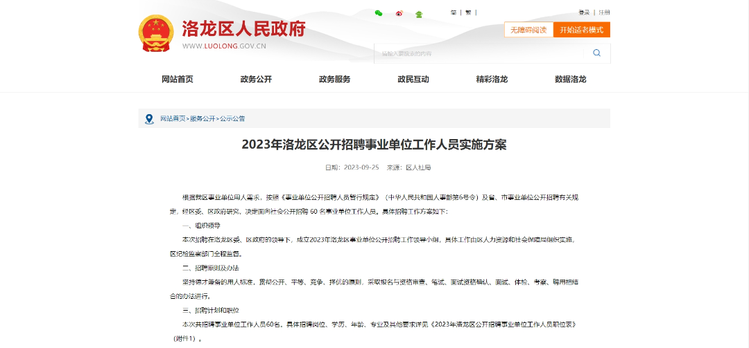 1、本次招聘所有环节的相关事宜、注意事项,以及通知、公告均在洛龙区人民政府网站(http://www.luolong.gov.cn/)进行公布,不再采取其他方式通知,请考生务必及时登陆查看。