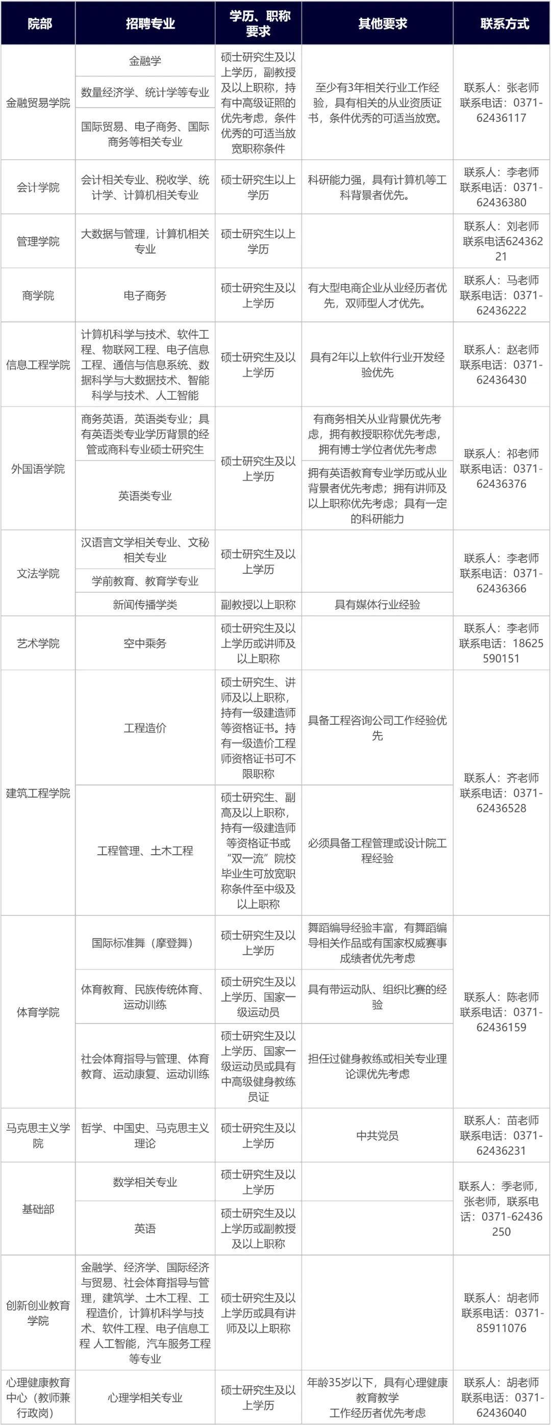 国际经济与贸易、金融学、会计学、财务管理、审计学、税收学、工商管理、酒店管理、市场营销、电子商务、物流管理、计算机科学与技术、软件工程、大数据、物联网、电子信息工程、通信与信息系统、智能科学与技术、人工智能、英语、翻译、学前教育、艺术类、汉语言文学、历史学、思政类、建筑学、土木工程、工程造价、工程管理、新能源汽车工程 | 海内外高校、科研院所博士研究生毕业,具有一定的学术水平和发展潜力,并取得相应的科研成果。 |