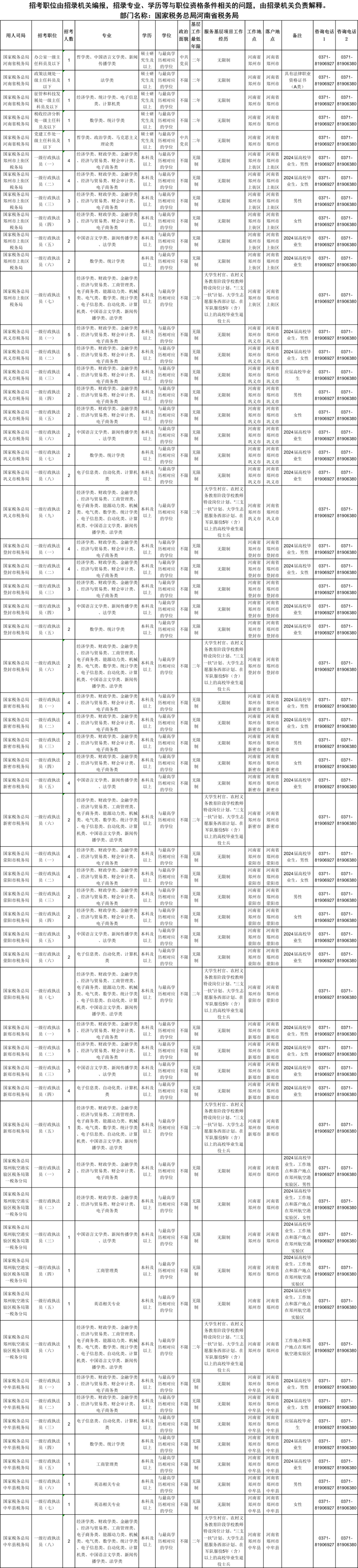 以下为河南税务局郑州区岗位