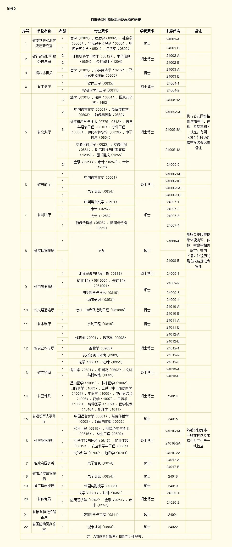 为贯彻落实中共中央组织部《关于进一步加强和改进选调生工作的意见》精神,经研究,决定定向国内部分高校选调2024年应届优秀毕业生到省直、省辖市市直机关工作。现将有关事项公告如下: 部分国内高校2024年硕士研究生及以上学历的应届毕业生(不含选调高校招生分数低于本校统一录取分数线的其他校区或分校、独立学院、网络学院等,以及委托培养、在职培养、定向培养和非全脱产学习的毕业生)。选调范围高校名单见附件1。 共计划选调527名,其中,省直选调生59名,省辖市市直选调生468名。 1.具有中华人民共和国国籍,且无国(境)外永久居留权。 2.政治素质过硬,对党忠诚,有理想抱负和家国情怀,甘于为国家和人民服务奉献。 3.截至2024年6月30日,应届硕士研究生不超过28周岁(1995年7月1日以后出生),应届博士研究生不超过35周岁(1988年7月1日以后出生),大学期间有参军入伍经历的,按服役年限适当放宽。 4.学习成绩优良,截至2024年7月31日,应取得相应毕业证书和学位证书,博士研究生可放宽到2024年底。报考学历学习期间,必修课不能有不及格记录。 5.报考省直岗位的考生,应为中共党员(含预备党员);报考省辖市市直岗位的考生,中共党员(含预备党员)优先。 6.作风朴实,诚实守信,吃苦耐劳,身心健康,有较好的人际沟通和语言文字表达能力。 7.具有正常履行职责的身体条件和心理素质,符合公务员录用体检标准。 凡在校期间有违法违纪违规行为、学术不端和道德品行问题的,或有《中华人民共和国公务员法》和其他有关法律法规规定不得录用为公务员情形的,不得报考。 选调工作采取本人自愿报名、学校审核推荐、组织人事部门考试与考察相结合的办法进行。具体安排如下: (一)网上报名。凡符合条件的高校应届毕业生均可于2023年11月20日10:00登录河南省选调生报名网站(http://xds.jyt.henan.gov.cn/)进入报名系统,按照提示进行注册,如实、准确、逐项填写相关信息,上传近期正面免冠证件照(蓝底,jpg格式,利用图片软件制作时,照片宽高比例约为1.3:1.6,大小为260×320像素,50-100kb,最终效果以输出后的大小为准),等待报名资格初审。报名截止时间为11月25日18:00。报考人员参照志愿代码表(附件2、3),每人可报考2个志愿。 (二)资格审核。通过网上初审的报考人员需将系统生成的报名表自行打印出来(附件4,正反面打印,一式3份),加盖院(系)党委公章后,报由所在高校学生就业指导部门审核,均需签署意见并盖章。 报考人员应于2023年12月1日前将报名材料邮寄至河南省大学生就业创业综合服务基地副楼一楼综合服务大厅B106室(郑州市郑东新区相济路81号,0371-61179352、61179396),邮寄报名材料的信封正面应标注“河南省选调生报名材料”字样,以寄到的邮戳日期为准,邮编450016。如确无法在截止日期前报送或邮寄到的,可先通过电子邮箱发送电子扫描件(邮箱:hnxdsbm@163.com,电子扫描件仅供预先审核使用,应与原件完全一致。资格终审仍以原件为准)。其中,河南大学、河南科技大学、河南农业大学、河南师范大学、河南理工大学、河南工业大学、华北水利水电大学、河南中医药大学等报名人员应于11月26日前将报名材料交校党委组织部进行择优推荐。 省委组织部干部队伍建设规划办公室、省教育厅学生处(河南省大中专学生就业服务中心)对符合条件的应届大学毕业生进行资格复审。 报考人员应于2023年12月6日前登录报名系统,查询复审结果。审核合格的,于12月13日9:00至12月16日9:00通过网上报名系统下载打印准考证。本次考试不收报名费。 资格审查贯穿招录工作全过程,弄虚作假或提供影响录用不实信息的,一经发现取消进入下一阶段资格。 (三)考试。考试分笔试、面试,综合成绩为笔试成绩×50%+面试成绩×50%。 1.笔试,2023年12月16日进行,共1张试卷,内容包括案例分析、行政能力测试、材料写作等,满分100分,考点设在郑州。笔试成绩将适时在报名网站公布,考生可登录报名系统查询。 2.面试,采取结构化面试方式,重点测试考生综合分析、语言表达、组织协调、人际沟通能力等,满分100分。根据考生填报第一志愿,按笔试成绩从高到低依次排序,以各岗位选调名额1:3的比例确定参加面试人员,如录用计划数与参加笔试人数比例达不到1:3,将优先从第二志愿报考该岗位且第一志愿未进入面试的考生中按成绩从高到低依次调剂补充。调剂补充后仍达不到比例要求的,相应核减招录名额。参加面试的应试者不能形成竞争的(即实际参加面试人数与拟录用人数的比例未超过1:1的),组织现有的应试者面试,应试者的面试成绩应达到其所在面试考场所有应试者的平均分,或者达到其所在面试考场其他岗位进入下步环节面试者最低分,方可进入下一环节。省直岗位的面试由省委组织部干部规划办统筹组织,省辖市市直岗位的面试由各省辖市党委组织部分别实施。参加人员名单及具体时间、地点另行通知。 (四)体检考察。面试第二天,按考试综合成绩从高到低排序,按选调名额1:1.5的比例确定体检人选名单,按照公务员录用体检标准等有关规定组织体检。体检合格的全部进入考察。 考察工作由省委组织部统筹安排,主要了解掌握人选在校表现和专业特长,特别是政治素质和道德品行情况,了解人选在校期间的学习成绩以及奖惩等情况。政治上不合格,或在校期间有违法违纪违规行为、学术不端和道