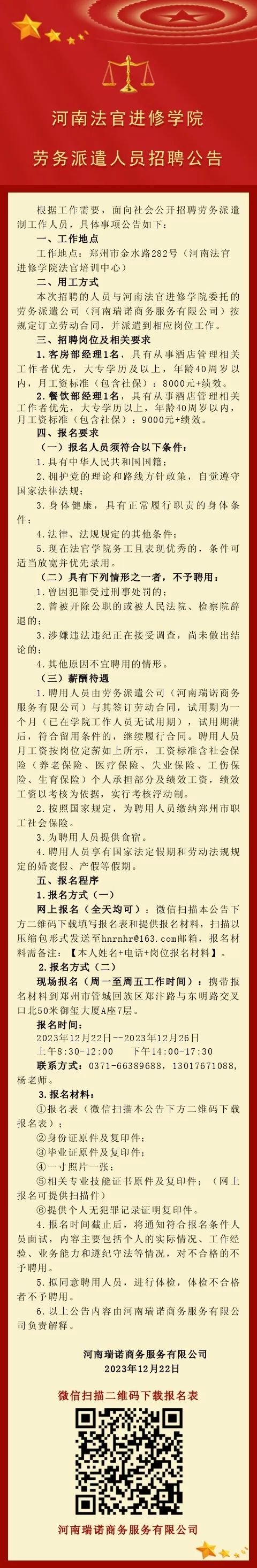 河南法官进修学院劳务派遣人员招聘公告!月薪8000-9000元!提供食宿!