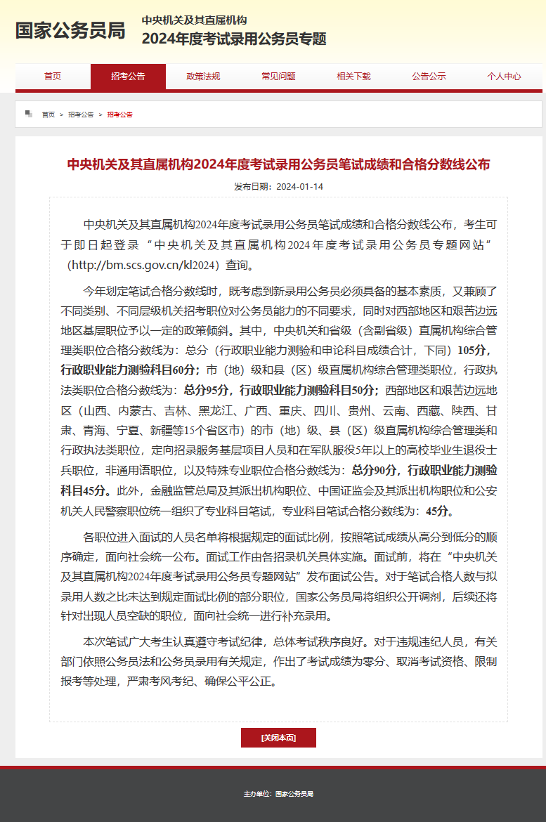 据国家公务员网站1月14日消息,中央机关及其直属机构2024年度考试录用公务员笔试成绩和合格分数线公布,考生可于即日起登录“中央机关及其直属机构2024年度考试录用公务员专题网站”(http://bm.scs.gov.cn/kl2024)查询。