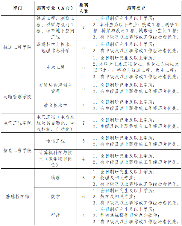 学校现有轨道工程学院、机车车辆工程学院、运输管理学院、信息工程学院、电气工程学院、装备制造工程学院、马克思主义学院、基础教学部、体育教学部、中专部等七院三部。现已形成以城市轨道交通运营管理、城市轨道交通车辆技术、城市轨道交通工程技术、铁道通信与信息化技术、铁道供电技术五个主干特色专业为主,空中乘务、大数据技术、物联网应用技术、电子商务等专业协调发展的专业格局。根据学校未来发展需要和师资队伍建设规划,现面向社会公开招聘专任教师岗、管理岗。