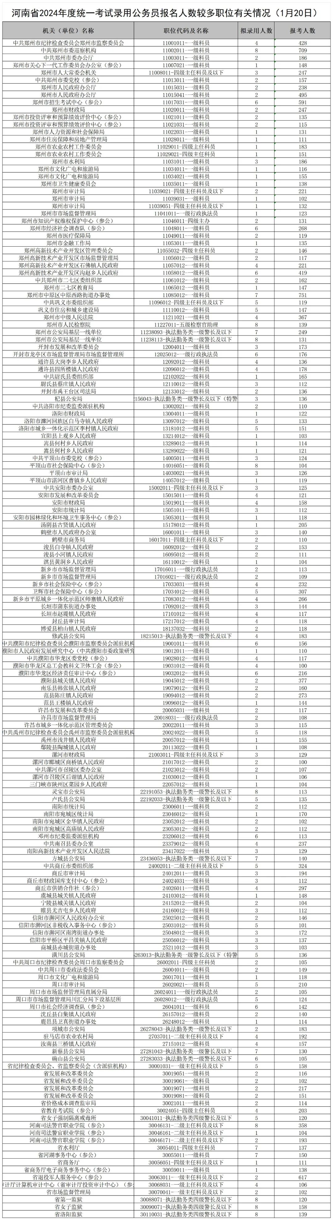 截至1月20日10:00,本次考试报名总人数为115735人,报名人数较多和较少的职位情况见附件。