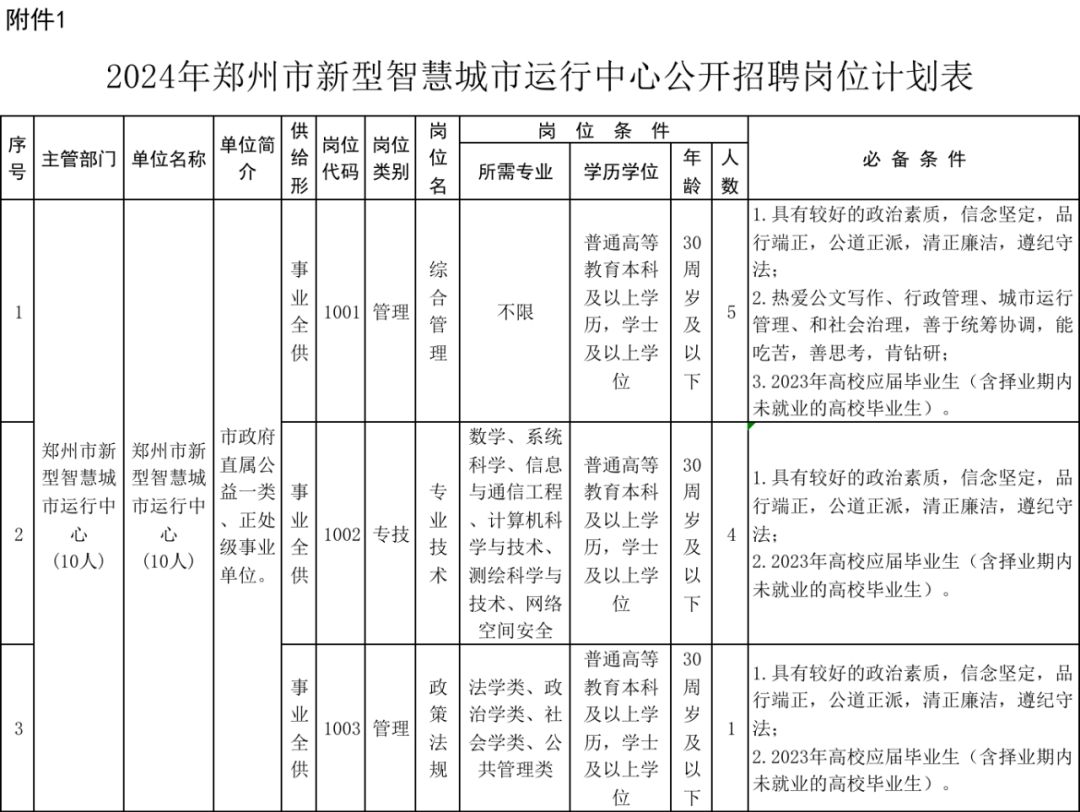 依据《事业单位人事管理条例》《郑州市事业单位新进人员管理办法》等有关规定,根据工作需要,面向社会公开招聘工作人员。现将有关事项公告如下:遵循公开、公平、竞争、择优的原则,通过公开招聘为事业单位选拔高素质人才,为推进郑州国家中心城市建设提供人才支撑。郑州市新型智慧城市运行中心公开招聘事业编制工作人员10人,专业岗位需求、招聘资格条件、计划人数等情况详见《2024年郑州市新型智慧城市运行中心公开招聘岗位计划表》(以下简称《岗位计划表》,详见附件1)。