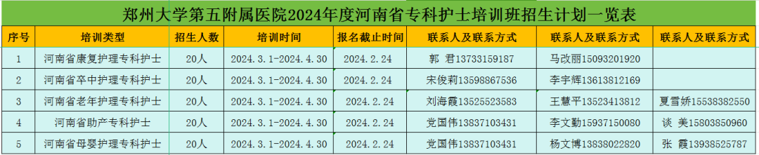 郑州大学第五附属医院2024年度河南省专科护士培训基地招生通知