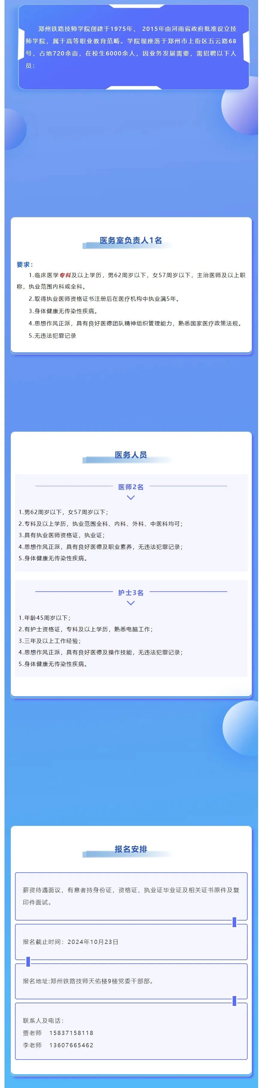 无夜班!大专护理可报!郑州铁路技师学院医务室人员招聘公告