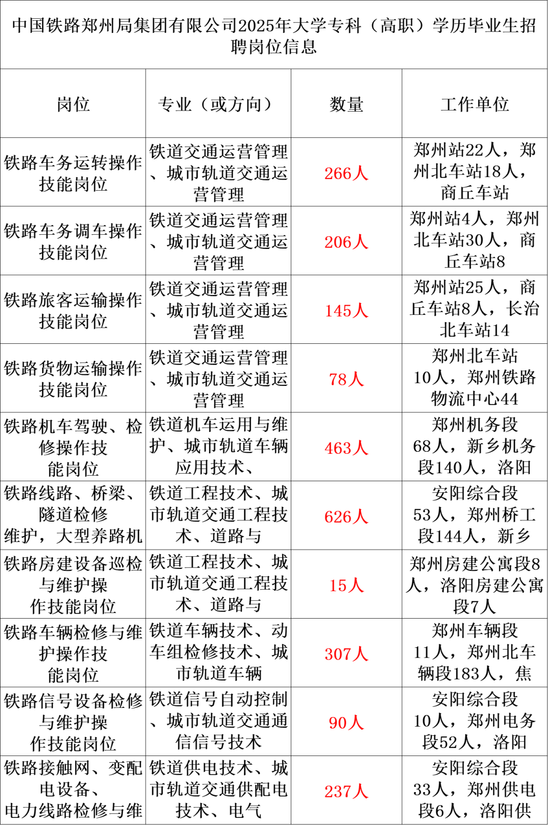 中国铁路郑州局集团有限公司2025年大学专科(高职)学历毕业生招聘岗位信息.pdf