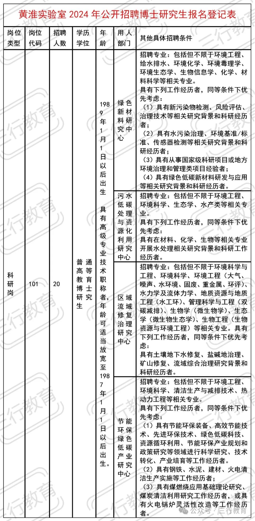 根据《河南省事业单位公开招聘工作规程》(豫人社〔2015〕55号)等有关规定,黄淮实验室拟面向社会公开招聘博士研究生20名。特制定公开招聘方案如下。黄淮实验室是河南省科学院举办、河南省委省政府批准设立的省实验室,由河南省科学院、中国环境科学研究院、环境基准与风险评估国家重点实验室共同牵头组建。公益二类事业单位,新型研发机构。黄淮实验室面向国家和河南省重大战略需求,瞄准环境保护和绿色低碳循环领域国际前沿,坚持服务河南、面向世界,创新融通、产业发展,实行“任务导向、交叉合作、协同攻关、开放共享”的体制机制,按照“理论原始创新-技术集智研发-成果就地转化”总体思路,构建“项目牵引、揭榜挂帅、产学研用互融”攻关模式,精心谋划多层多维协同创新新路径,打造绿色发展和生态环境集智创新引擎,营造一流创新生态,引育并举,面向全球不拘一格招揽人才,力争在新污染物防治、区域流域治理与系统修复、绿色低碳材料与重大装备研发、污水治理与资源化利用、智能感知体系与风险预警防控、减污降碳协同增效等新兴前沿交叉领域和具有黄淮地区中原特色的优势领域取得一批原创性科学成果,努力把黄淮实验室建设成为贯通产学研用的科研实体、生态环境保护和低碳绿色循环先进技术的国家实验室和国家科技创新中心、生态环保创新创业人才中心,为全国提供美丽中国和高质量发展的河南技术、河南方案、河南示范、河南样板和河南蓝图。招聘工作在省人力资源社会保障厅指导下组织实施。成立由实验室主要领导任组长,实验室其他相关领导和有关部门负责同志为成员的招聘工作领导小组,实验室人力资源部门负责公开招聘的组织、协调等具体工作。本次公开招聘的岗位为科研岗。具体招聘岗位、专业、数额及条件要求,详见《黄淮实验室2024年公开招聘博士研究生一览表》(附件1)。